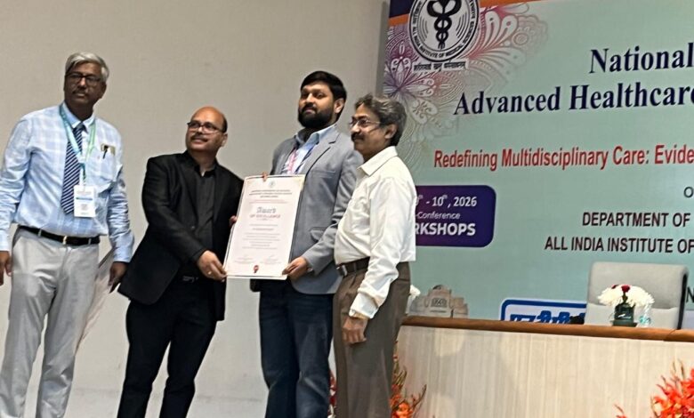 नई दिल्ली स्थित All India Institute of Medical Sciences के जवाहर लाल ऑडिटोरियम में 12 अप्रैल 2026 को आयोजित नेशनल कॉन्फ्रेंस ऑन एडवांस हेल्थकेयर एंड रिहैबिलिटेशन साइंसेज (NCAHRS-AIIMS) के अवसर पर कानपुर के प्रसिद्ध फिजियोथेरेपिस्ट Dr. Rajneesh Tripathi को “चिकित्सा सेवा सम्मान पत्र” से सम्मानित किया गया।कानपुर स्थित ग्लोबल क्लिनिक के निदेशक डॉ. त्रिपाठी को यह सम्मान स्वास्थ्य एवं पुनर्वास (Rehabilitation) के क्षेत्र में उनके उत्कृष्ट योगदान, मरीजों के प्रति समर्पण तथा आधुनिक फिजियोथेरेपी तकनीकों के प्रभावी उपयोग के लिए प्रदान किया गया।
