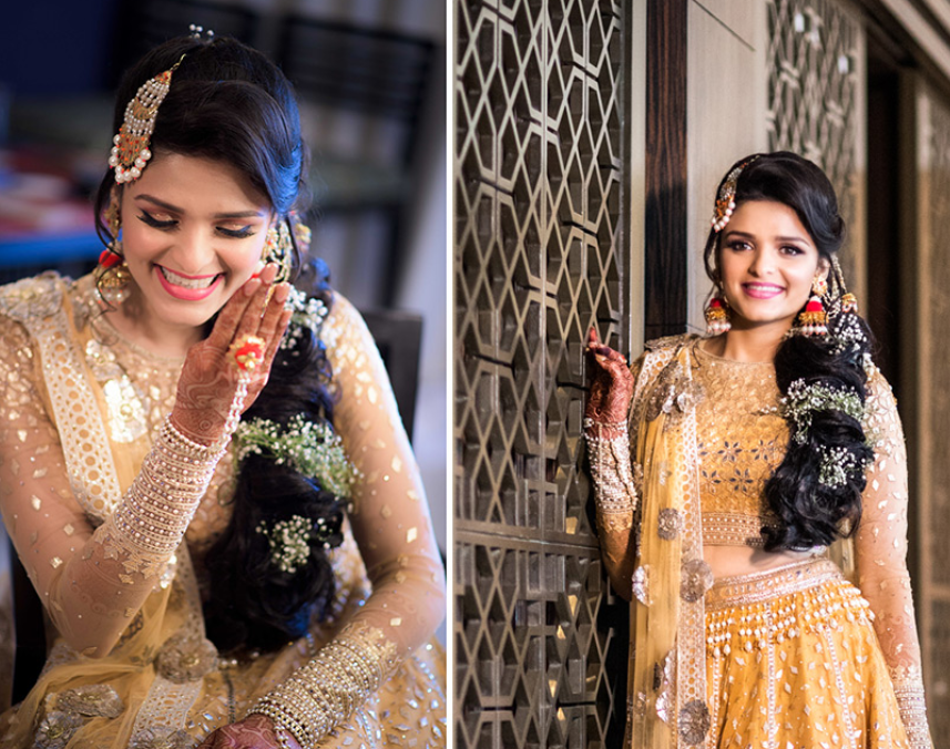 चोटी में फूलों को गूंथकर एक बेहद रोमांटिक लुक पाया जा सकता है। इसमें मांग टीका जोड़ने से दुल्हन का लुक और भी निखरता है।