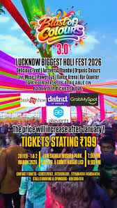 राजधानी लखनऊ में होली के पर्व को और भी यादगार बनाने के लिए ‘ब्लास्ट ऑफ कलर्स 3.0’ का भव्य आयोजन किया जा रहा है। यह आयोजन 28 फरवरी, 1 और 2 मार्च 2026 को जनवेश्वर मिश्र पार्क, गोमती नगर (गेट नंबर-5) में आयोजित होगा। आयोजकों के अनुसार यह फेस्ट दोपहर 1 बजे से रात 8 बजे तक चलेगा।इस होली फेस्ट में रंगों के साथ-साथ लाइव म्यूज़िक, पावर डीजे, डांस एरीना, बार काउंटर, ऑथेंटिक ठंडाई, ऑर्गेनिक रंग और स्वादिष्ट फूड स्टॉल्स की विशेष व्यवस्था की गई है। आयोजक इसे लखनऊ का सबसे बड़ा होली फेस्ट बता रहे हैं।कार्यक्रम के लिए अर्ली बर्ड टिकट ऑनलाइन प्लेटफॉर्म बुक माय शो, डिस्ट्रिक्ट (ज़ोमैटो), ग्रैब माय स्पॉट और ऑलइवेंट्स पर उपलब्ध हैं। टिकट की शुरुआती कीमत ₹199 रखी गई है, जबकि आयोजकों ने बताया कि जनवरी के बाद टिकट की कीमतों में बढ़ोतरी की जाएगी।आयोजकों ने शहरवासियों से अपील की है कि वे समय रहते अपने टिकट बुक कर इस रंगारंग आयोजन का हिस्सा बनें। कार्यक्रम से संबंधित टिकट, स्टॉल बुकिंग और स्पॉन्सरशिप के लिए संपर्क नंबर भी जारी किए गए हैं।