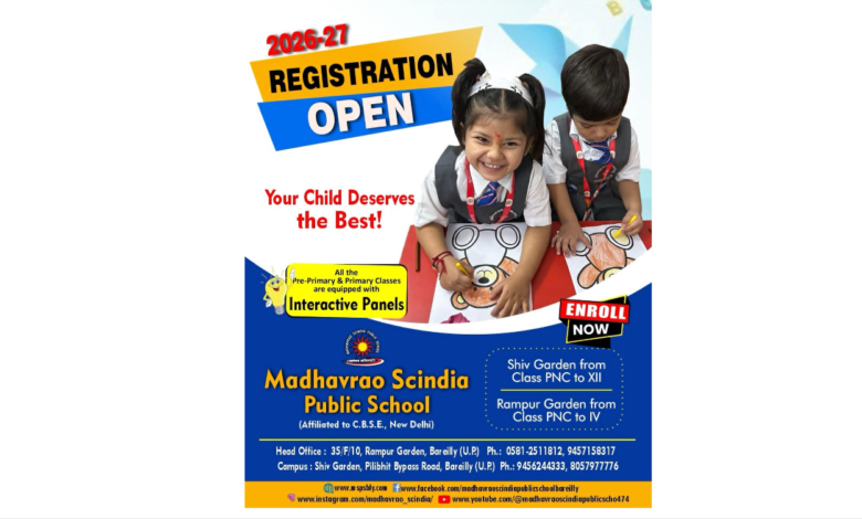 माधवराव सिंधिया पब्लिक स्कूल में नए सत्र के लिए प्रवेश प्रक्रिया प्रारंभ हो चुकी है। विद्यालय की वेबसाइट पर ऑनलाइन आवेदन फॉर्म उपलब्ध हैं। सीबीएसई से संबद्ध यह विद्यालय प्री-नर्सरी से कक्षा 12 तक गुणवत्तापूर्ण शिक्षा के साथ-साथ खेल, कला एवं अन्य सह-पाठ्यक्रम गतिविधियों में भी उत्कृष्ट अवसर प्रदान करता है, जिससे विद्यार्थियों का सर्वांगीण विकास सुनिश्चित किया जा सके।