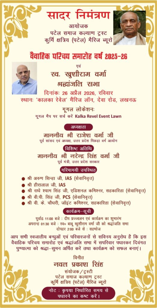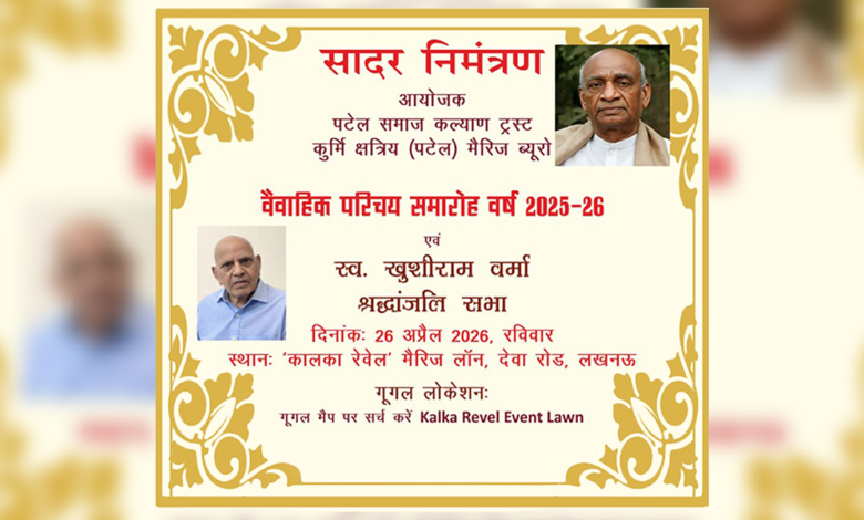 पटेल समाज कल्याण ट्रस्ट एवं कुर्मी क्षेत्रीय (पटेल) मैरिज ब्यूरो द्वारा वैवाहिक परिचय समारोह वर्ष 2025-26 का आयोजन आगामी 26 अप्रैल 2026 (रविवार) को किया जाएगा। इस अवसर पर स्वर्गीय खुशीराम वर्मा की स्मृति में श्रद्धांजलि सभा भी आयोजित की जाएगी।