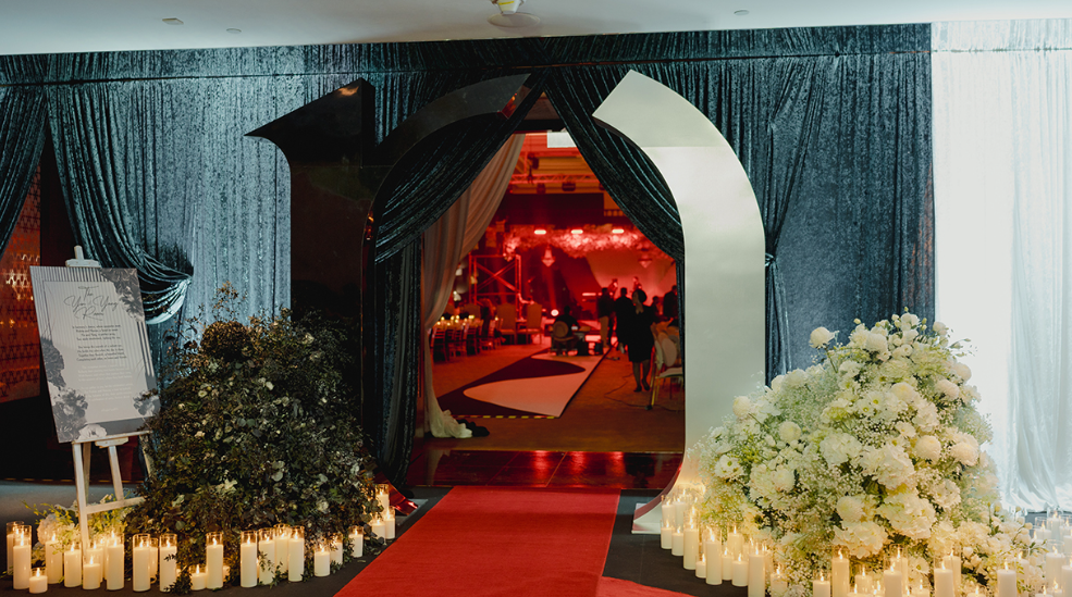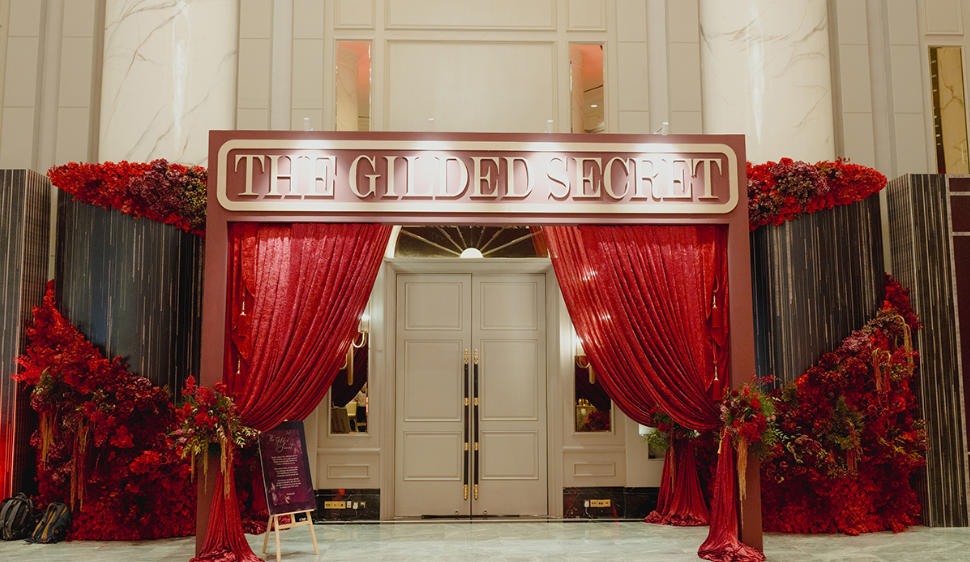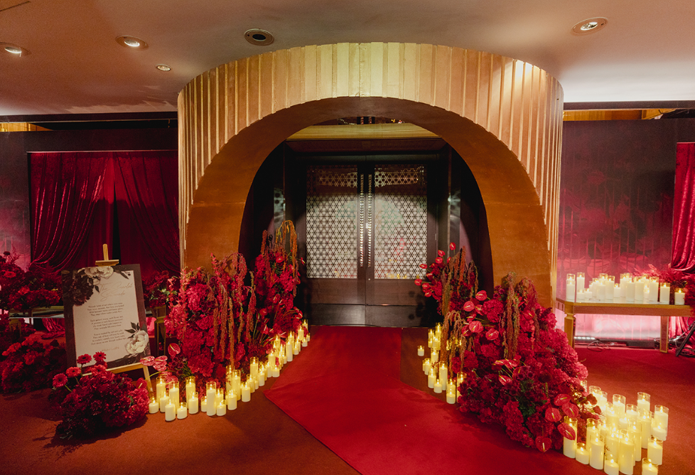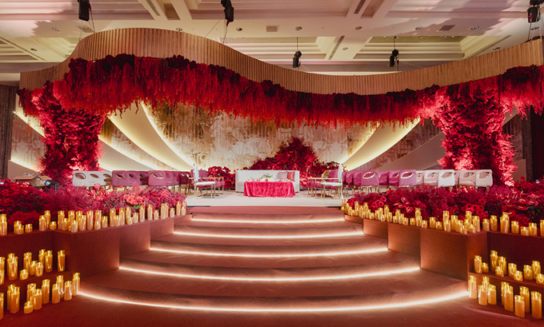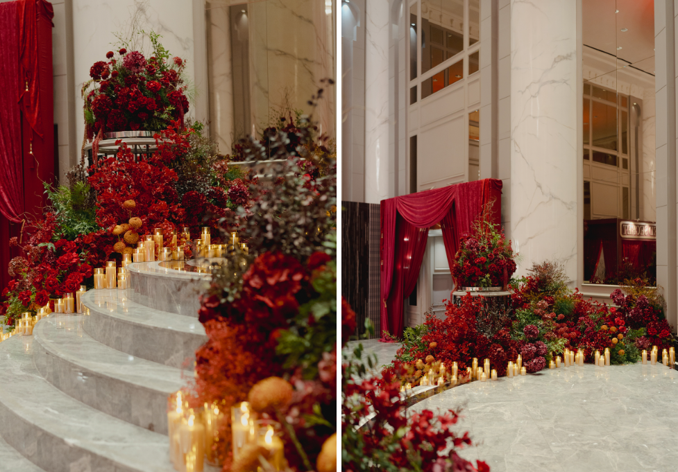 विवाह और रिसेप्शन का थीम “द स्कारलेट सेरेनेड” रखा गया, जिसमें गुलाब और रोमांटिक रंगों का खूबसूरत संयोजन देखने को मिला। मार्सला, बेज और रेड के साथ ब्लैक के टच ने पूरे माहौल को शाही और ड्रीमी बना दिया।