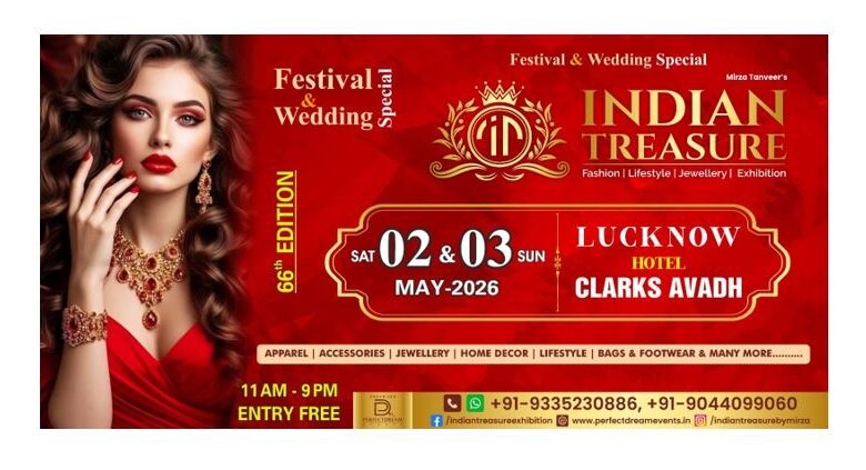 लखनऊ। राजधानी लखनऊ में फैशन और वेडिंग शॉपिंग का सबसे पसंदीदा आयोजन “इंडियन ट्रेजर” एक बार फिर अपने भव्य अंदाज़ में लौट रहा है। यह प्रतिष्ठित प्रदर्शनी 02 व 03 मई 2026 (शनिवार व रविवार) को Hotel Clarks Avadh में आयोजित की जाएगी। कार्यक्रम दोनों दिन सुबह 11:00 बजे से रात 9:00 बजे तक चलेगा।